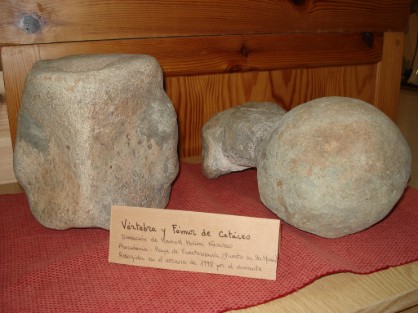 Entre lo más notable adquirido este año, contamos con un objeto regalado por el modesto cuanto entendido anticuario y arqueólogo D. Juan Franco, ingeniero segundo de la empresa de abastecimiento de aguas de la ciudad. Este objeto ha sido extraído hecho pedazos del interior del macizo de la cantera de S. Cristobal y es, a lo que parece, una enorme vertebra de un gran cetáceo, que tiene la apófisis bien distintas y sirve para acreditar que la citada sierra está formada por un levantamiento submarino, o al menos que otro tiempo sus flancos o faldas estuvieron cubiertas por el mar. A cierta distancia del objeto indicado y dentro también de la piedra se encontró un trozo de fósil, que así mismo poseemos, como de una vara de largo, y parece el extremos de una costilla del mismo animal”.
